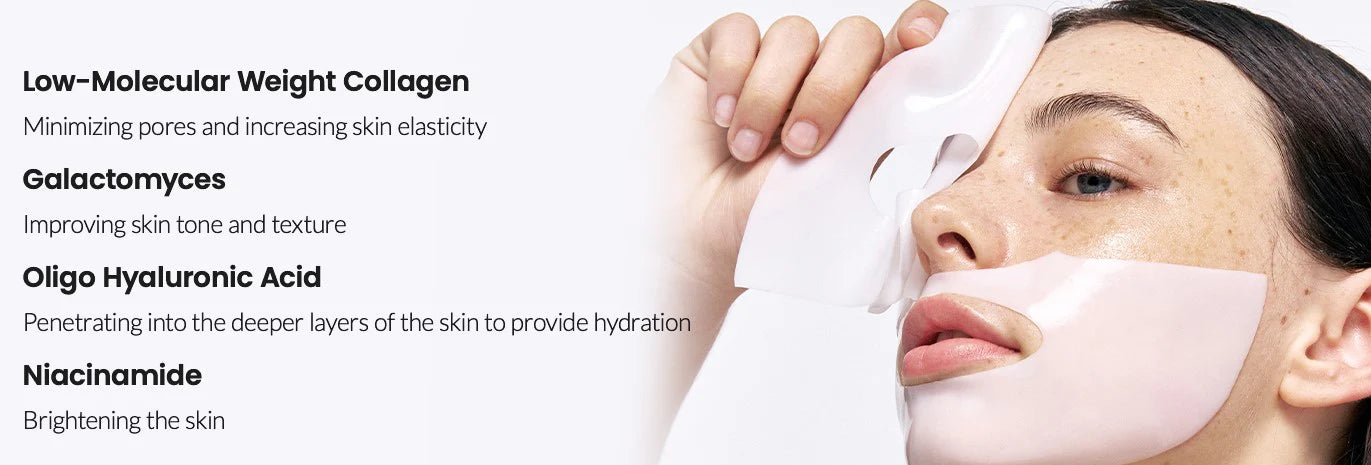 Infused with ultra-low molecular collagen, this mask is a game-changer for pores and elasticity. It effortlessly refines enlarged pores, boosts skin elasticity instantly, and visibly smooths fine lines and wrinkles.